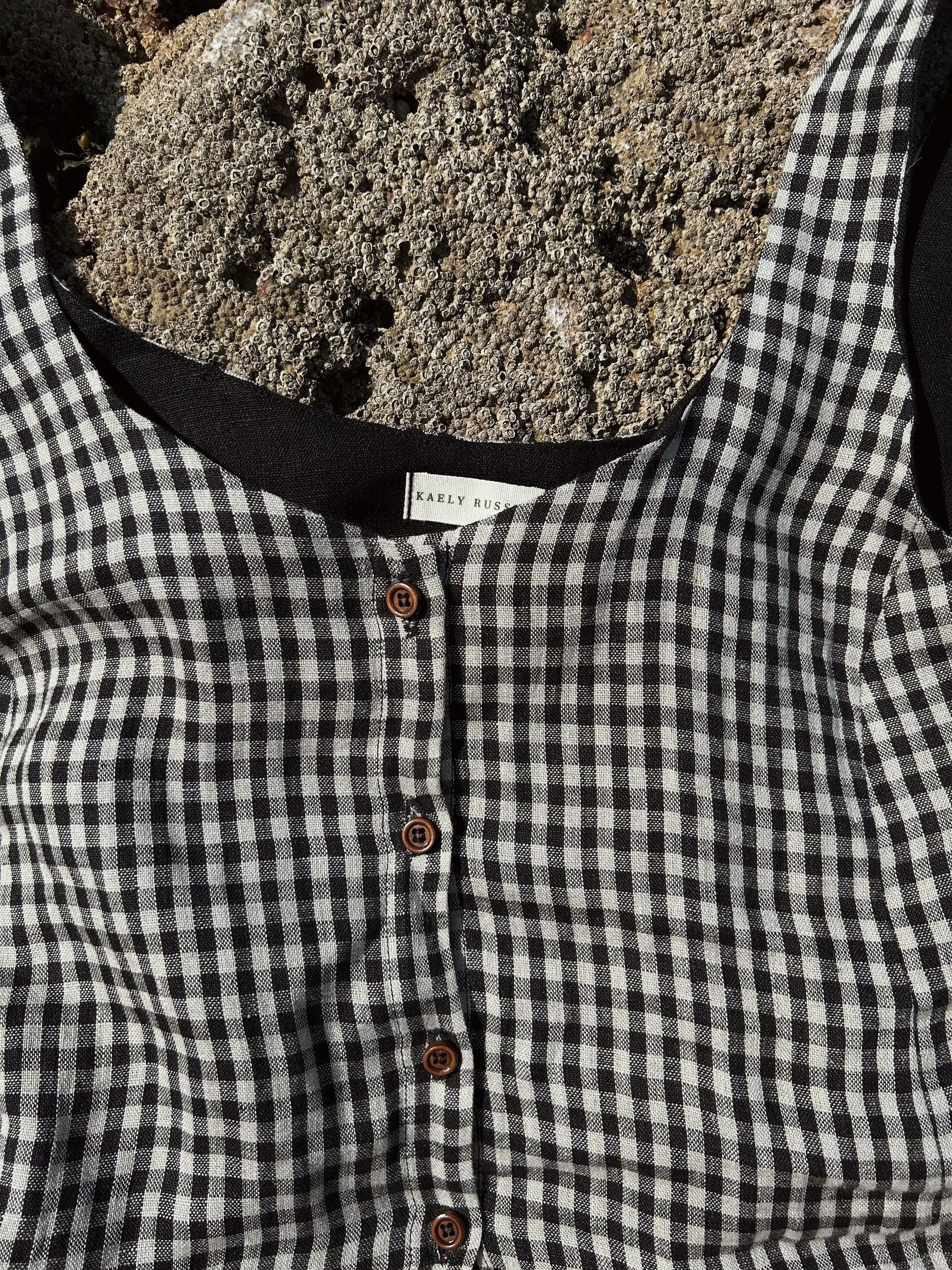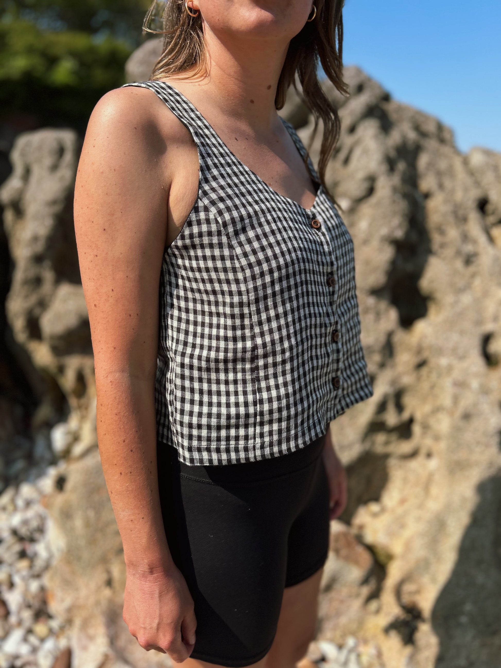 Brand new for SS25 the May cami is a cropped cut with a slightly loose fit. It features wide straps, a scoop neck and back and 4 dark wood buttons down the centre front. Princess seams at the bust for a flattering fit. Cut from a beautiful soft European linen in a black and oat gingham.