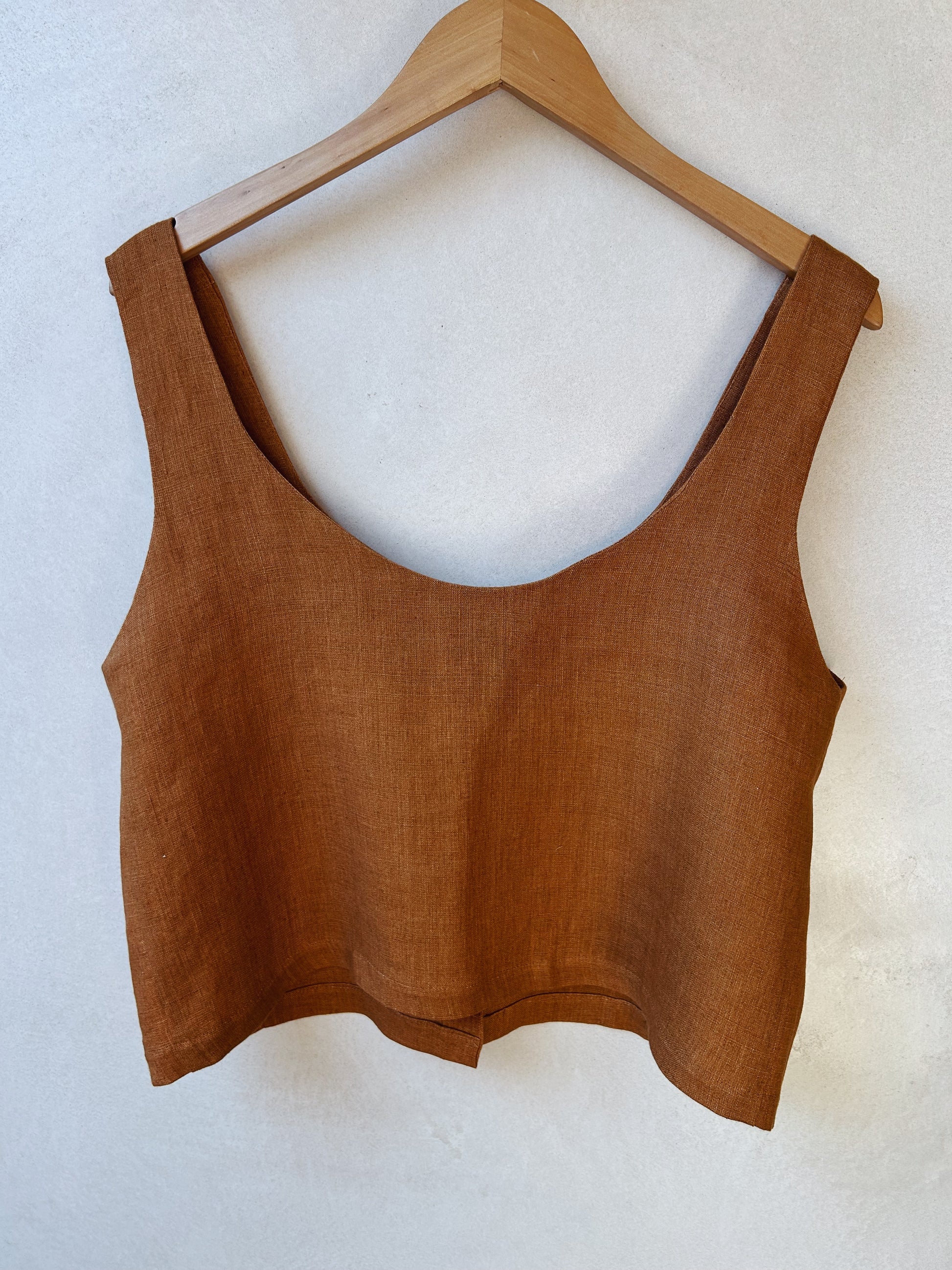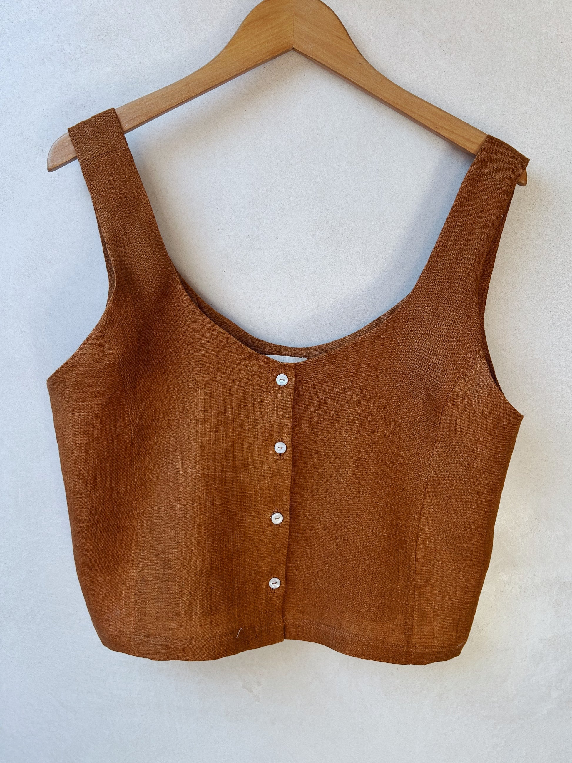 Brand new for SS25 the May cami is a cropped cut with a slightly loose fit. It features wide straps, a scoop neck and back and 4 shell buttons down the centre front. Princess seams at the bust for a flattering fit. Cut from a beautiful soft European linen. This linen has been dyed with an enzyme dye meaning it will fade gradually over time.