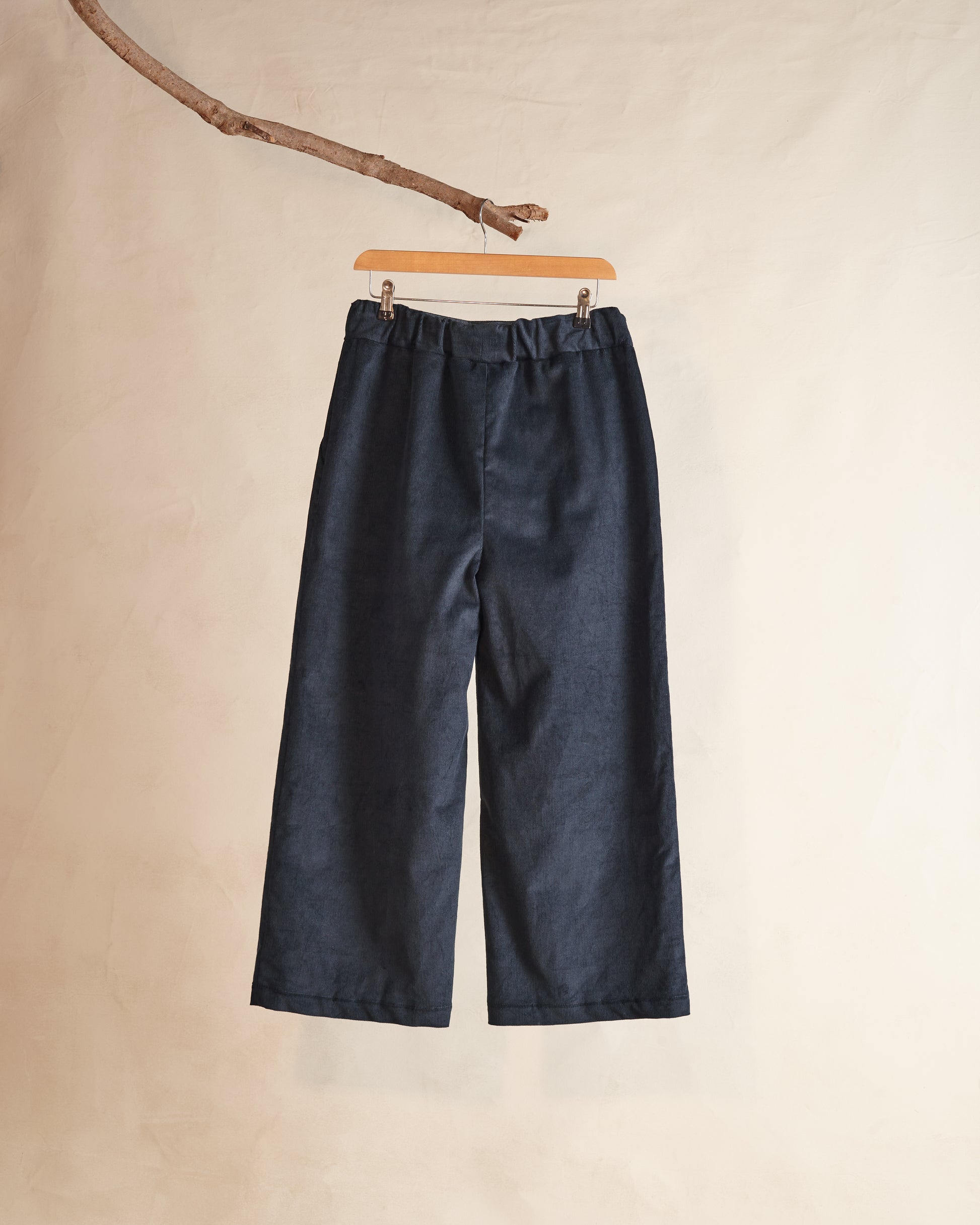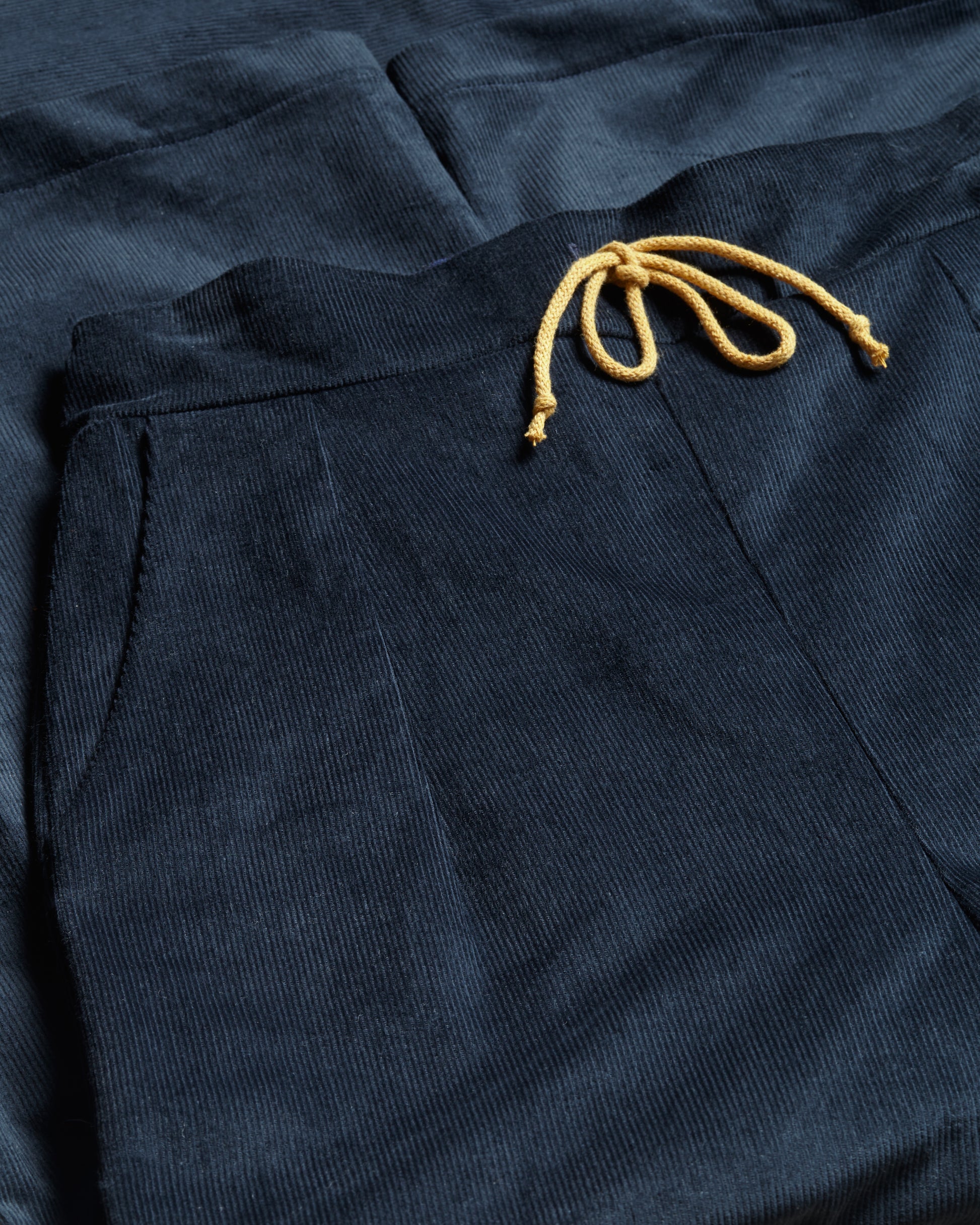 Cut from 100% organic cotton needlecord with a soft yet durable finish. For comfort, the waistband is half elasticated at the back and studio off cut fabrics have been used to line the inside of the waistband.
