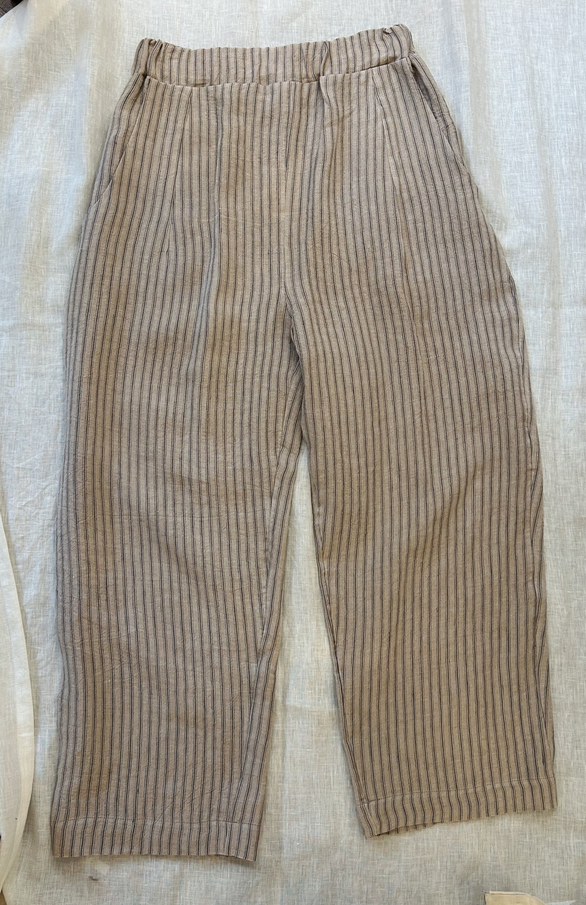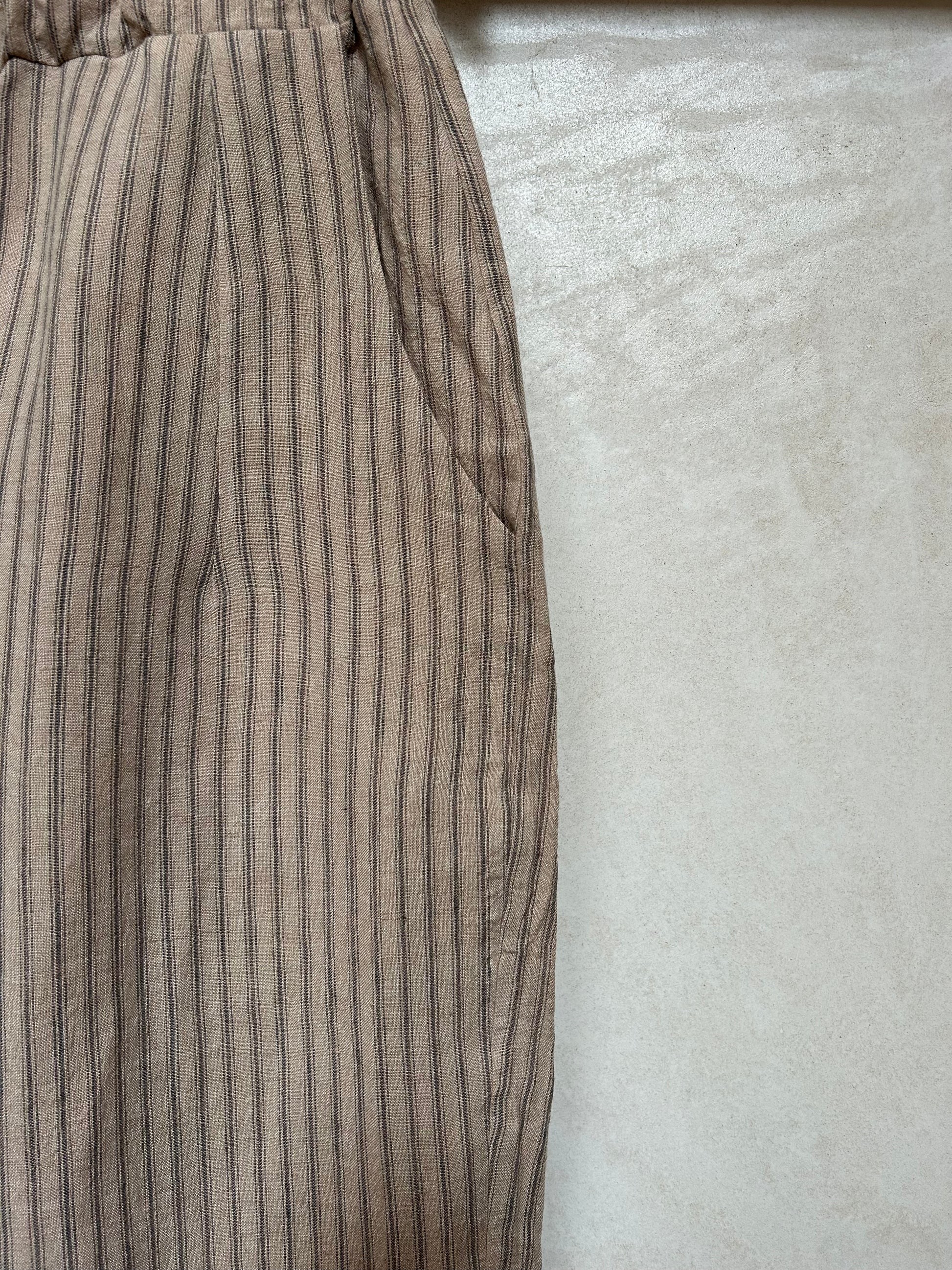 Cut from 100% European linen in a beautiful soft putty colour with a grey stripe. The waistband is elasticated for a super comfy fit and two deep pockets have been added for all the essentials.