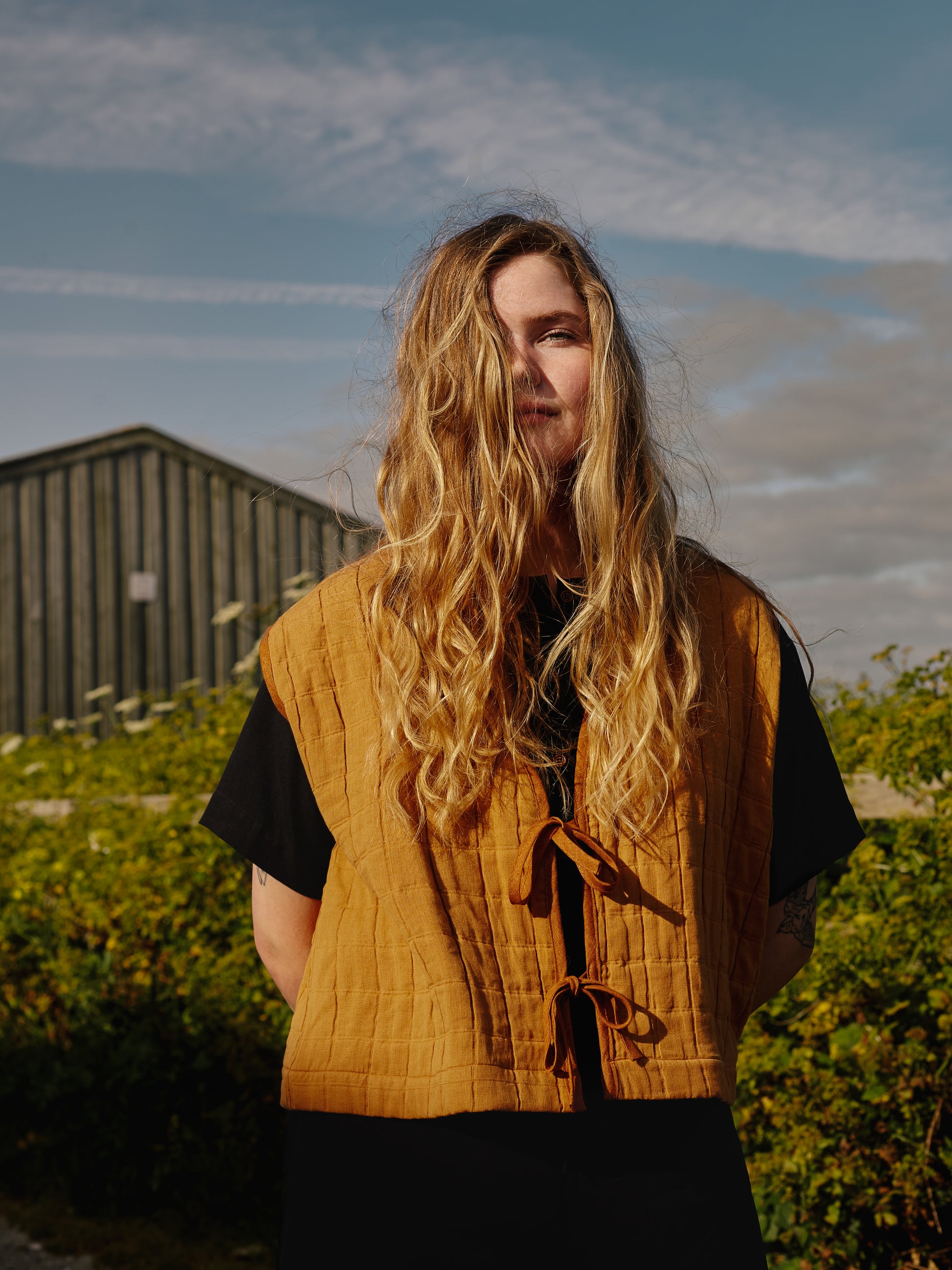 A loose cut vest made in soft quilted cotton in a rich amber shade. Perfect for as an easygoing layer for extra body warmth during the colder months or as a lightweight jacket paired with a t-shirt during spring and summer. Featuring two fabric tie fastenings on the centre front and bound armholes.