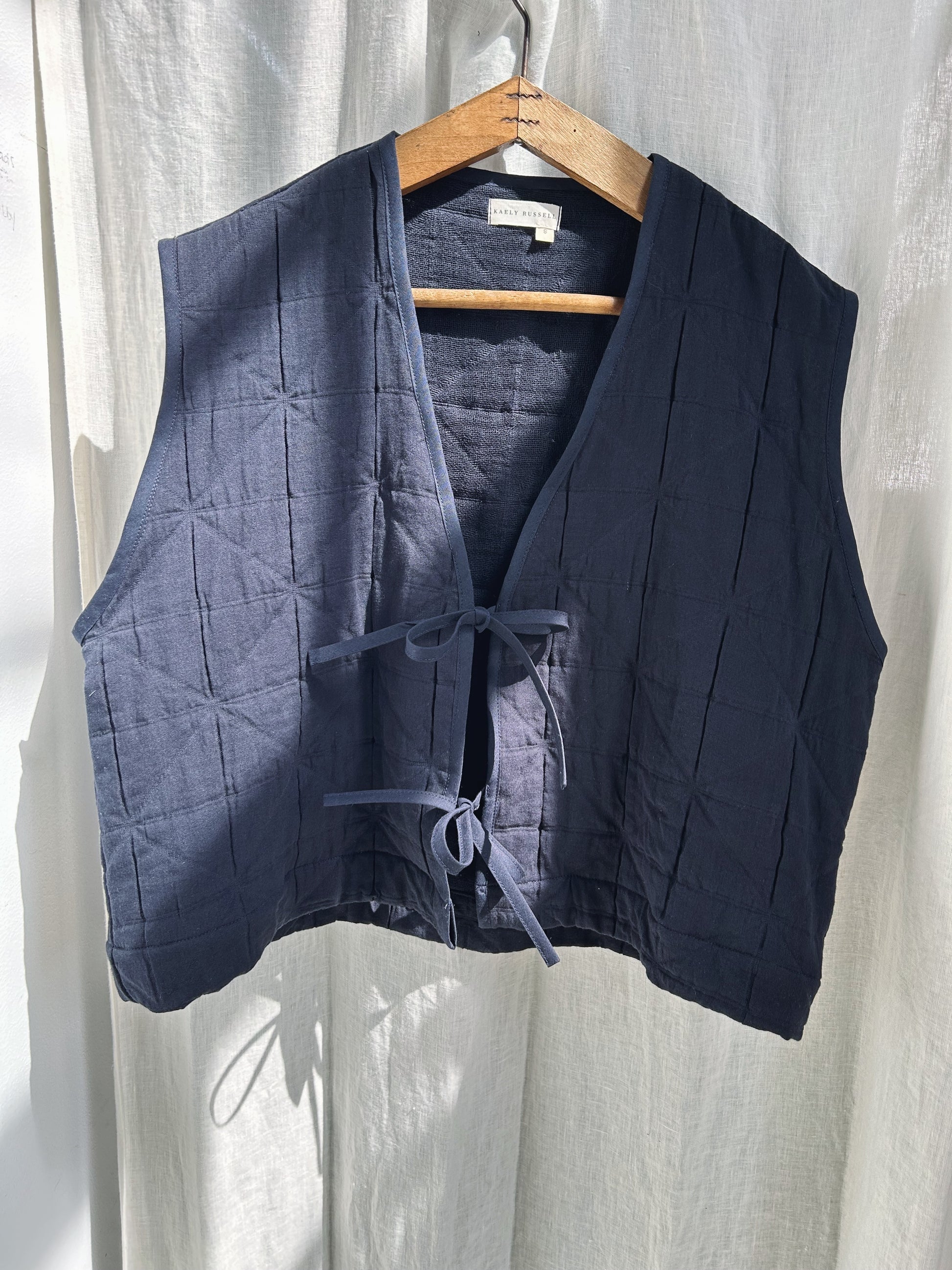 A loose cut vest made in soft quilted cotton. Perfect as an easygoing layer for extra body warmth during the colder months or as a lightweight jacket paired with a t-shirt during spring and summer. Featuring two fabric tie fastenings on the centre front and bound armholes.