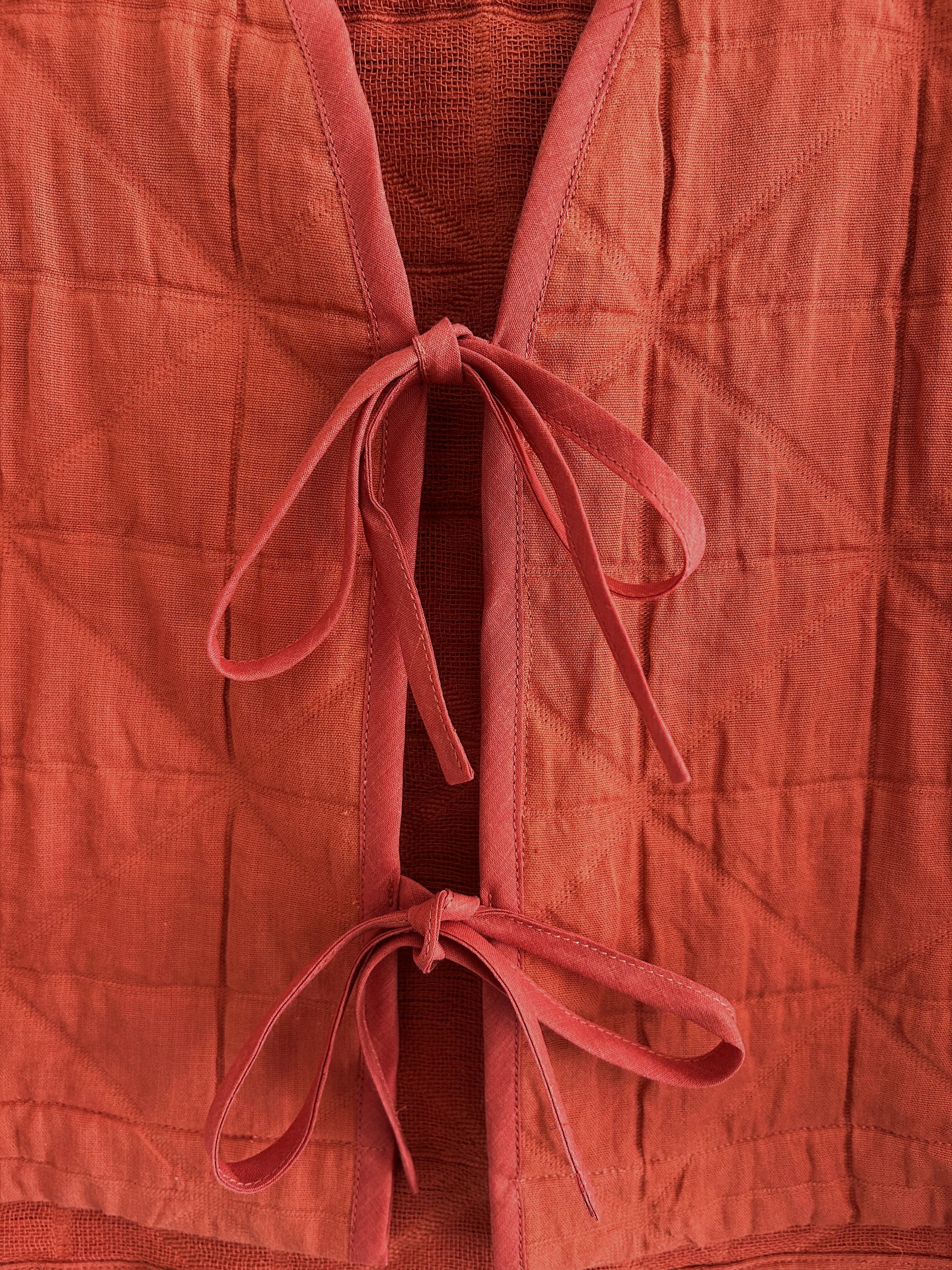 A loose cut vest made in soft quilted cotton. Perfect as an easygoing layer for extra body warmth during the colder months or as a lightweight jacket paired with a t-shirt during spring and summer. Featuring two fabric tie fastenings on the centre front and bound armholes.